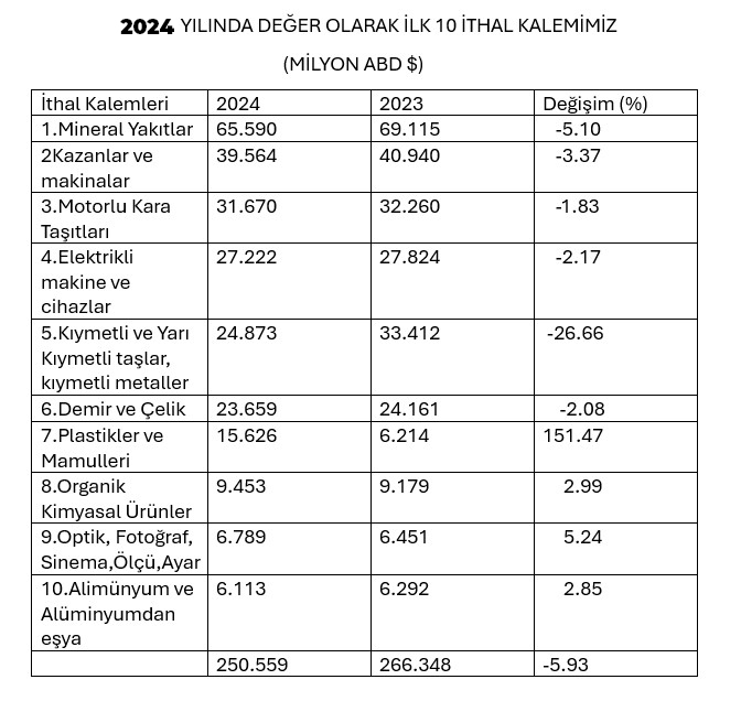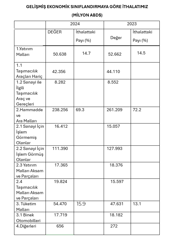 Yatırım malları ithalatımız artan yatırım ihtiyacımıza rağmen 2024 de %3,85, sanayimizin çarklarını döndüren hammadde ve ara malları ithalatımız ise %8,79 oranında gerilemiştir.